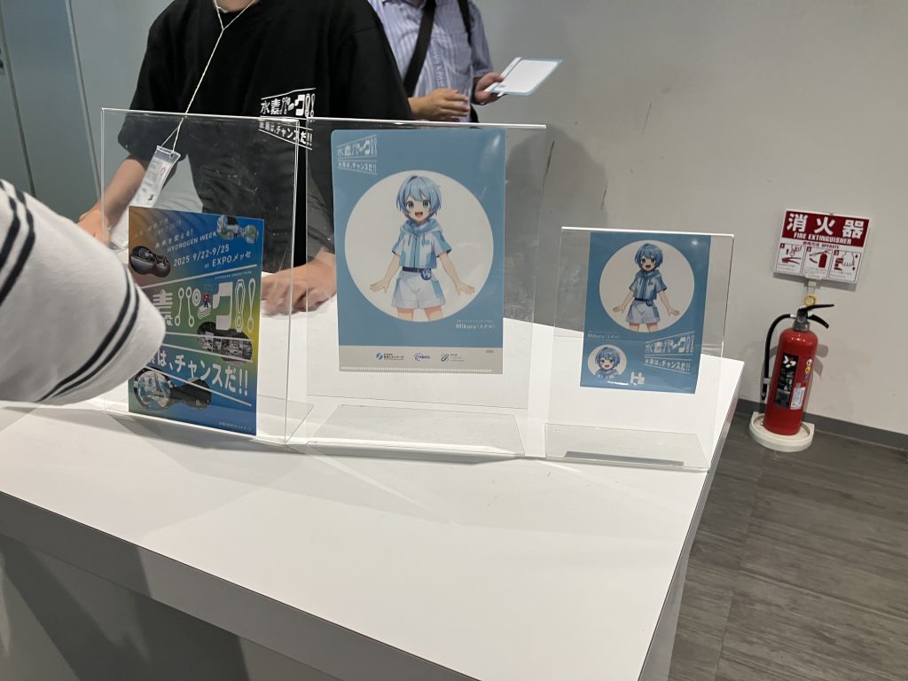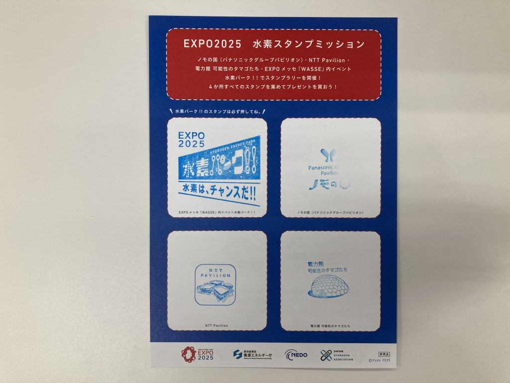 水素パーク内のスタンプラリーで写真右のステッカー、出口のアンケートに回答すると写真左のクリアファイルがもらえます。そして広い万博会場内を歩いてスタンプを集めると、同じくステッカーがもらえます。日によっては別のノベルティだったようです。