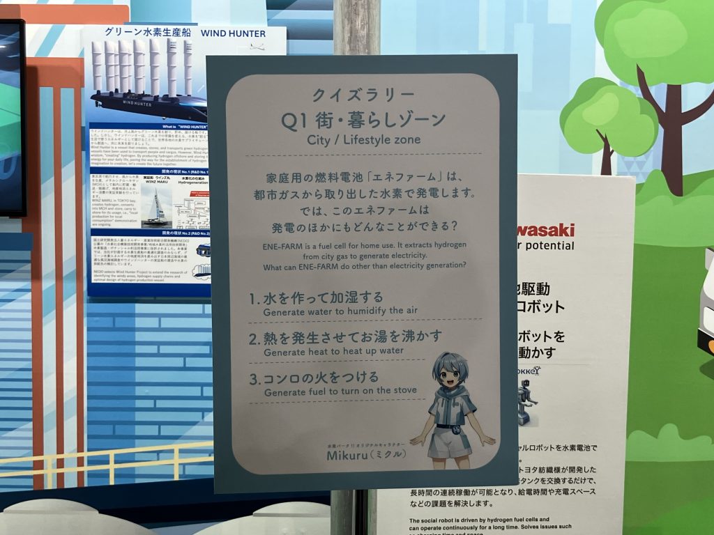 ミクルは時空を超えて2025年に移動し、わたしたちに2050年の水素エネルギーが普及した世界を紹介してくれます。パーカーの時が2050年で、Tシャツの時が2025年ですね。水素エネルギーの普及もすごいですが、2050年には時空を超えることができるようになっているのもすごいです。