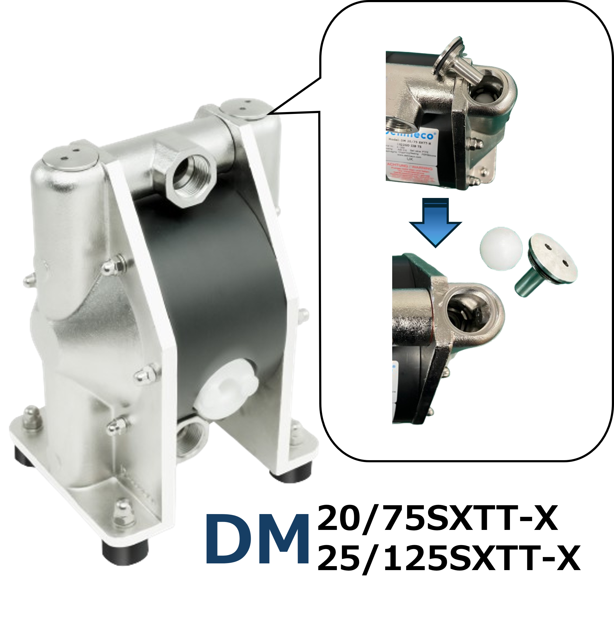 DELLMECO製メタルシリーズの従来型ダイアフラムポンプは、ハウジング一体型バルブシートにより部品点数が少ない点が特長でしたが、バルブシート変形時にはハウジングごとの交換が必要という課題がありました。新たに、バルブシート交換が可能なステンレス製ダイアフラムポンプをラインナップ。万一変形が生じても、バルブシートのみの交換で対応できるようになりました。